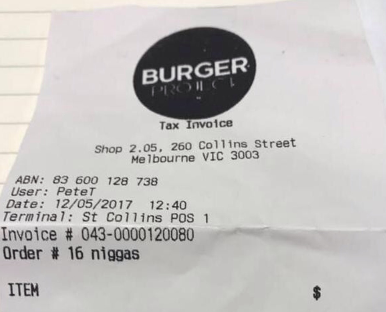 Rutendo Ruth Muchinguri became aware of the issue after her “hard working black husband” Nicholas, had lunch with friends. In a Facebook post Mrs Muchinguri wrote: “Dear Burger Project, “My hard working black husband went to your Collins St store to have lunch with his friends and this is a photo of his receipt for the order. “It is so disappointing that in a place where my husband spent his hard earned money, he received this sort of disgracefully discriminatory treatment. It’s exhausting that in 2017, in a modern and multicultural society some of your staff remain insensitive to the impact that this insidiously nasty and vile word has”.