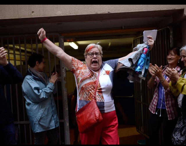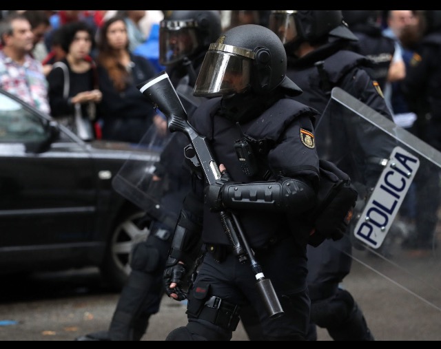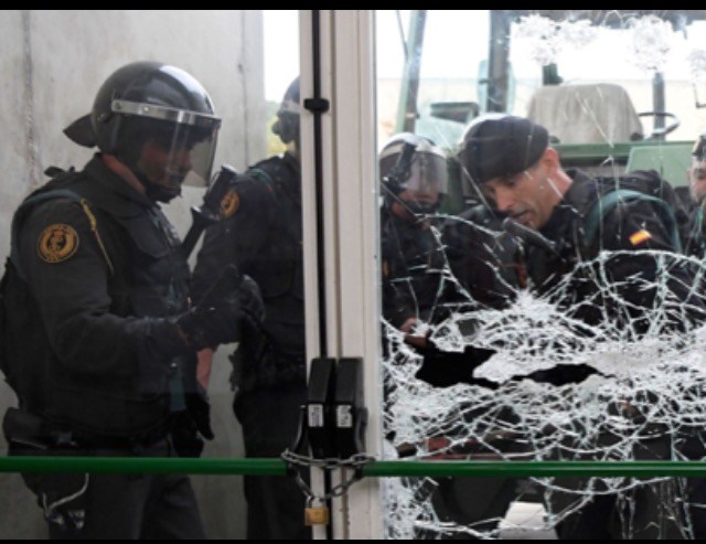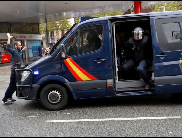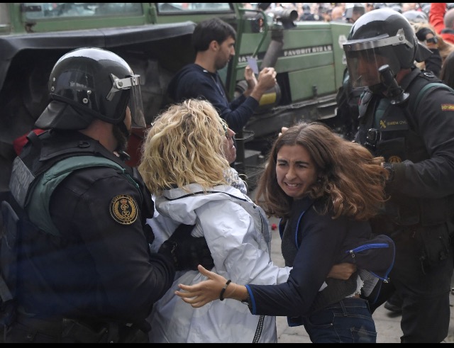 A woman resist arrestPolice van arrives to stop the referendumSpanish Police arresting protestersPolice smash entrance of polling stationCatalonians resist police force