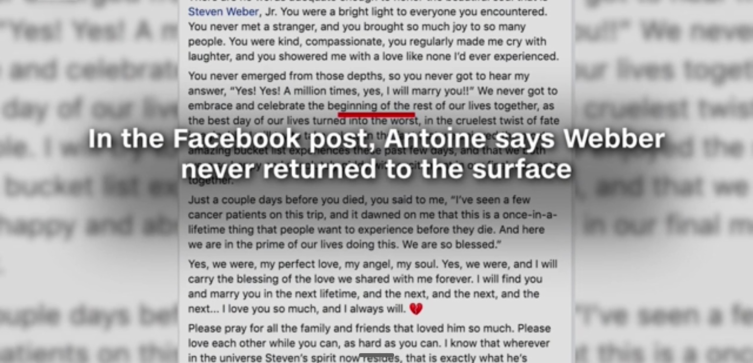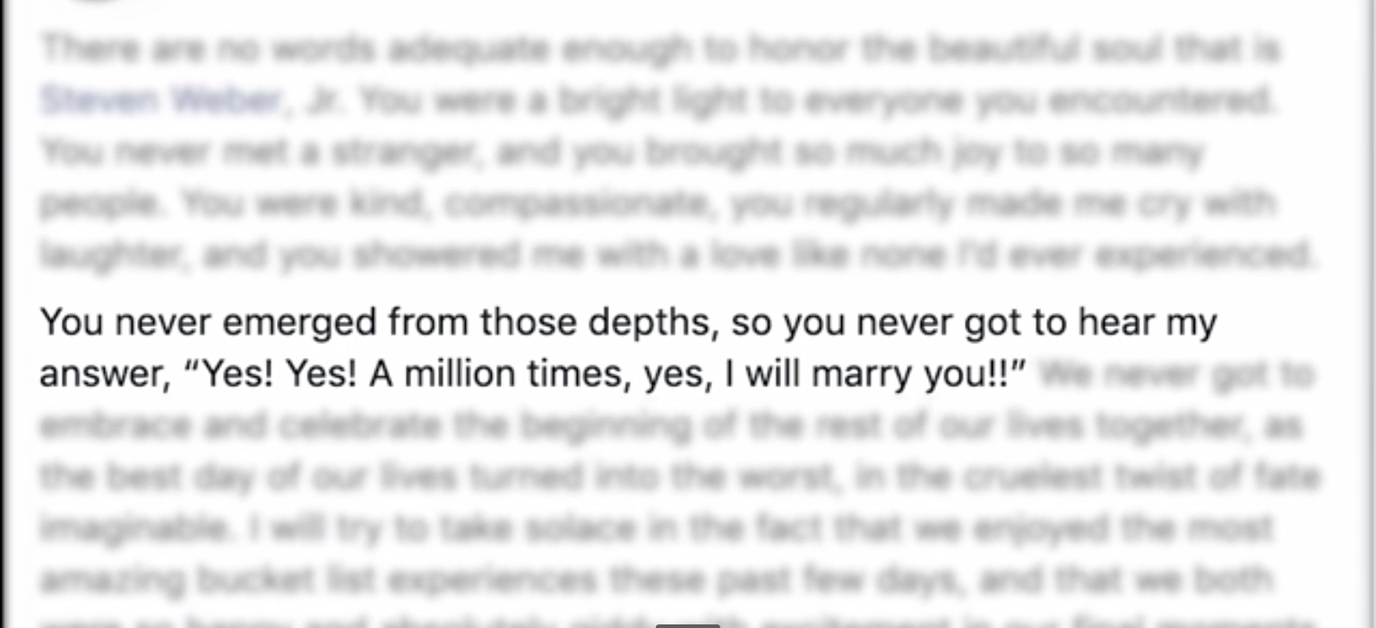 In a twist of cruel fate, Steven Weber drowned just after he proposed to his girlfriend under water. According to Steven’s sister, “the trip had been planned for almost a year, and they were very much looking forward to it, we knew that he wanted to propose to her and he decided that this was the most wonderful time to do it. It was the trip of a lifetime, and he really wanted to surprise Kenesha with this proposal, we don’t know yet if he was injured on the way up, if he hit his head on something or if he had a heart attack,” she said. “We really don’t know all of the details yet, other than he did drown.”