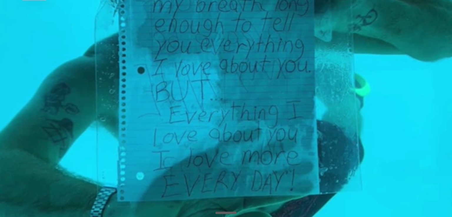 During the proposal, Weber placed a note inside a transparent plastic bag that read, “I can’t hold my breath long enough to tell you everything I love about you. BUT…Everything I love about you I love more EVERY DAY! “Will you please be my WIFE,” the note continued. “Marry me???” Tragic, things men do for love eh!?