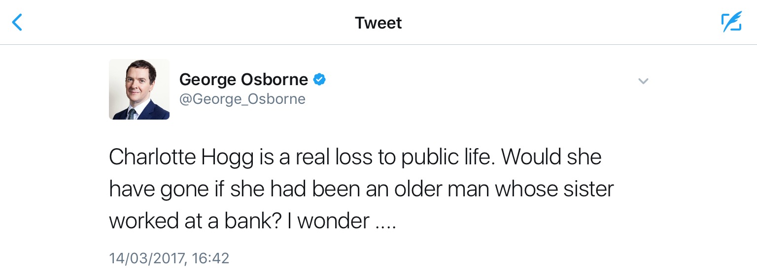 Charlotte Hogg, Deputy Governor of the Bank of England resigned after a select committee of MPs criticised her non-disclosure of her brother’s working status at Barclays Bank, apparently breaking the rules when she failed to disclose that information. Was George Osborne right to suggest the case would have been different had it been a man involved, is the UK still struggling with women equality? Let’s hear your thought