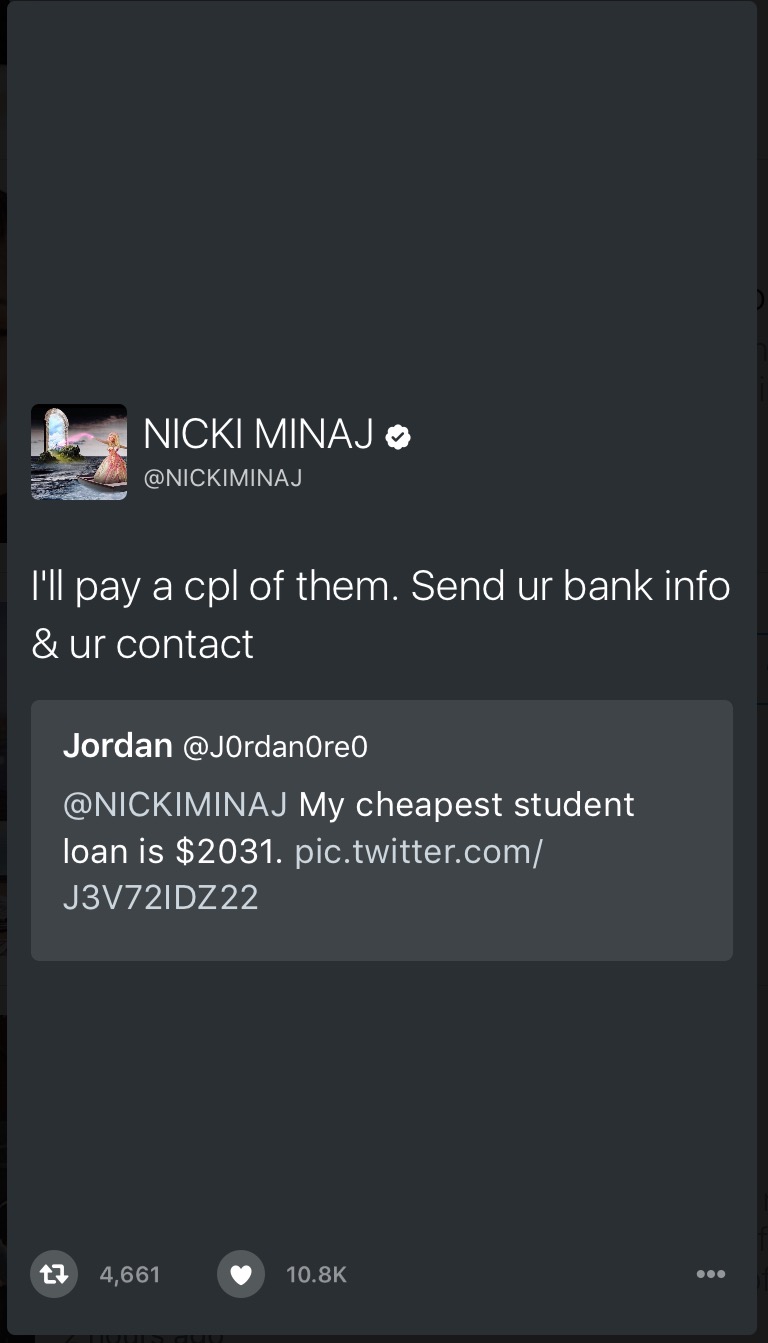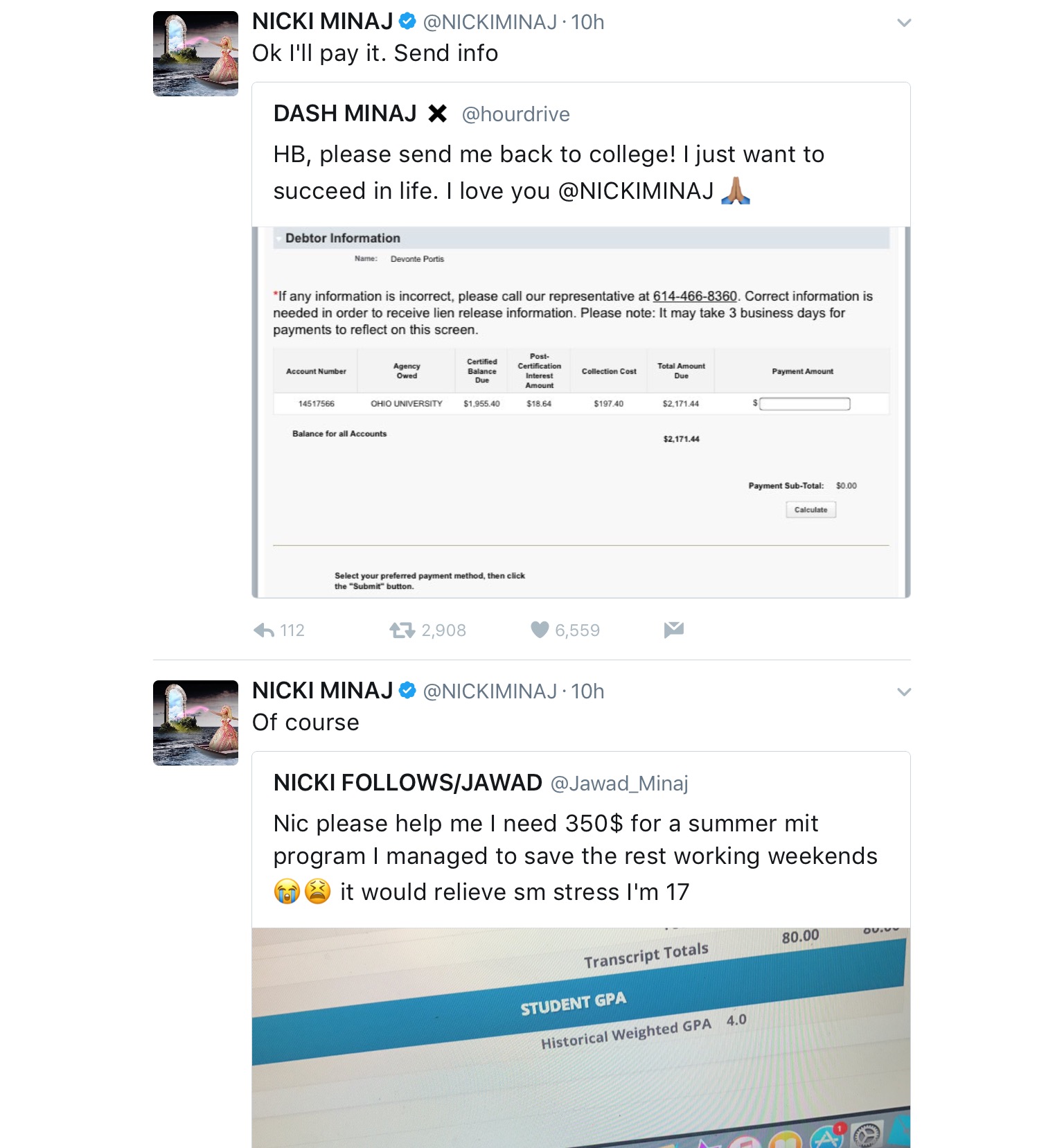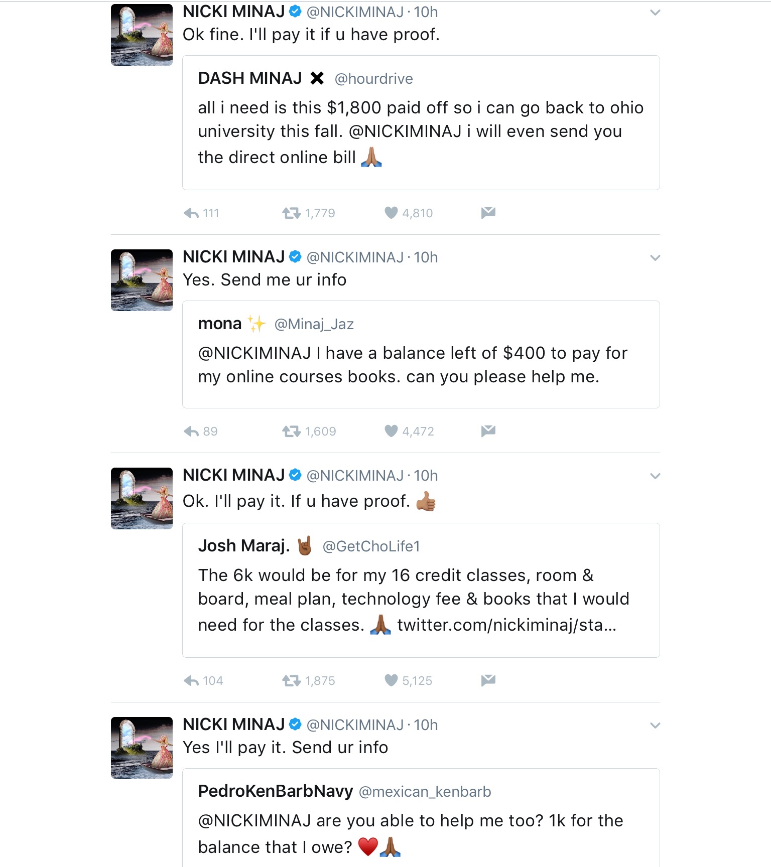 The rapper hardly makes headlines for the right things, but the singer surprised millions of her fans when she asked her twitter peeps struggling to pay for their education to show proof so she could pay. See some of the tweets below.