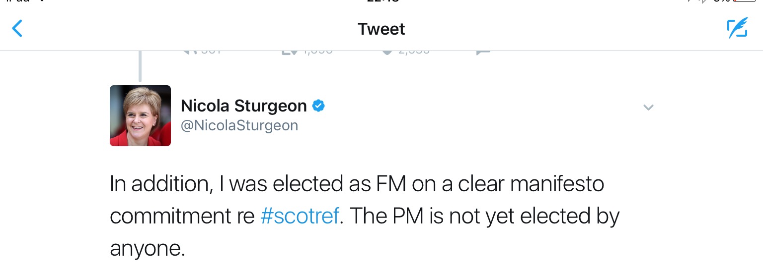 The First Minister’s tweet about her mandate for Indyref2 The war of words continue as Nicola Sturgeon suggested via a tweet that she is a legitimate office holder while the PM is not. Is she right? It's only fair to share... Published by NR View all posts by NR